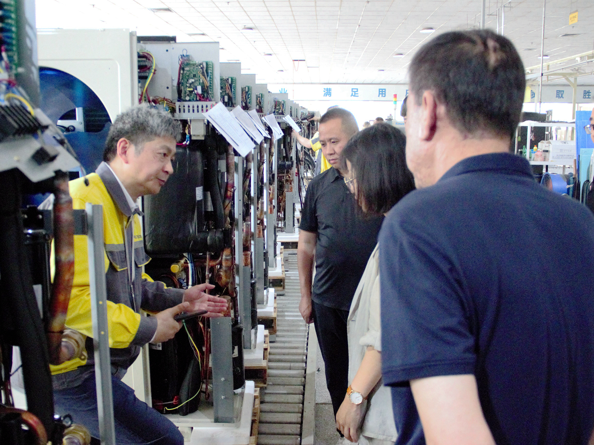 从侧门出服务平台,映入眼帘的便是荣事达空气能工厂。荣事达空气能工厂负责人白礼鹏对领导们的到来表示热烈欢迎,陪同一行人重点参观工厂自动化生产线以及超低温实验室的运作。
