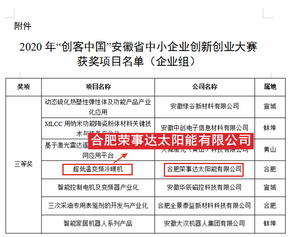安徽省经信厅发布《关于公布2020年“创客中国”安徽省中小企业创新创业大赛获奖名单的通知》,荣事达空气能“超低温变频冷暖机”项目荣获三等奖
