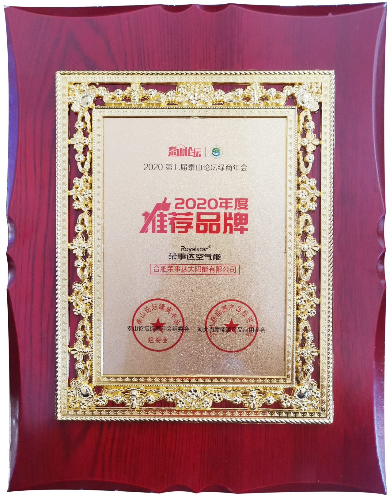 2020第七届泰山论坛绿商年会上,荣事达空气能收割泰山论坛“推荐品牌”荣誉。
