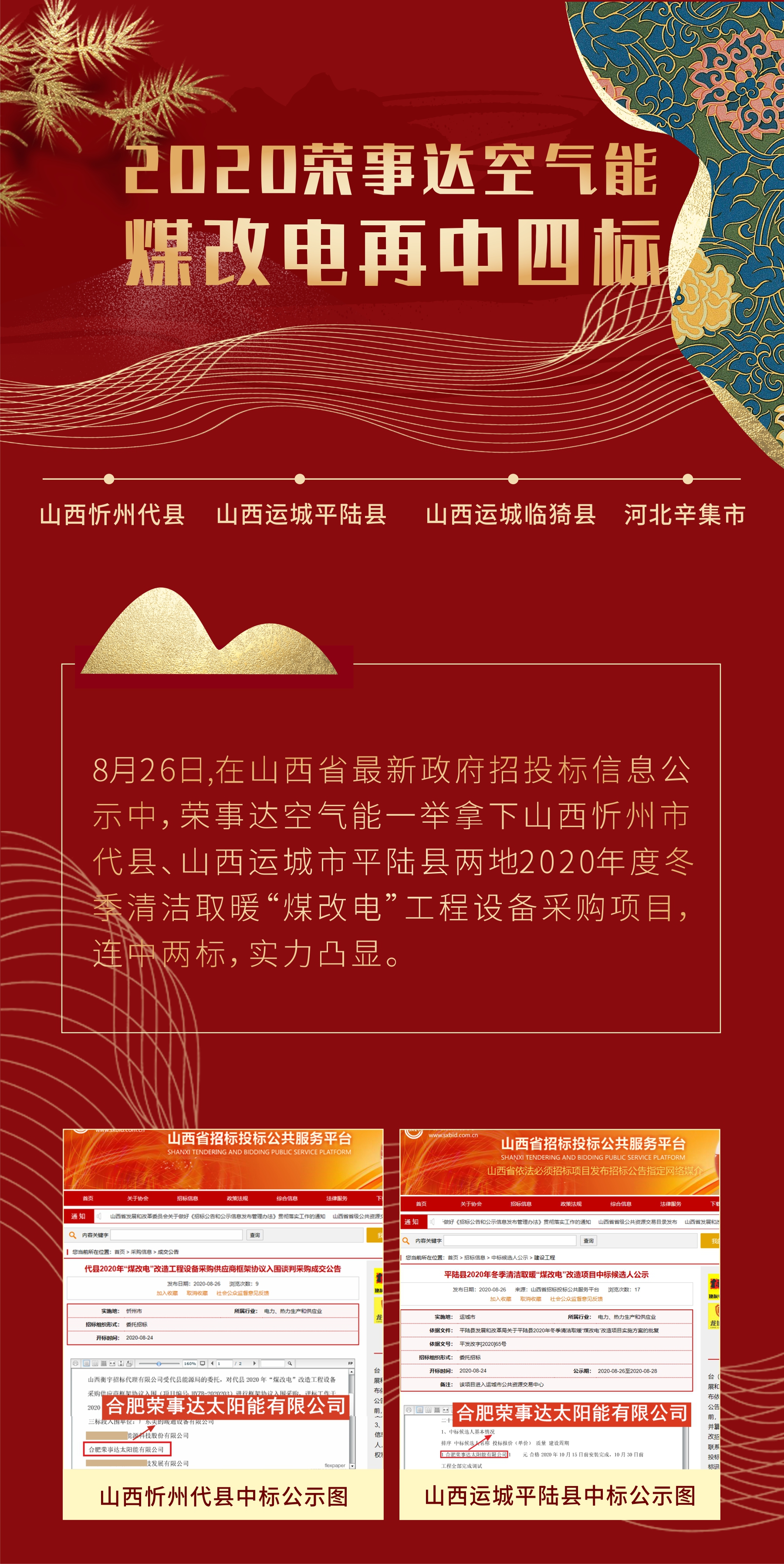 荣事达空气能再中标四地煤改电!『山西临猗县、河北辛集市、山西代县、山西平陆县』拿下!