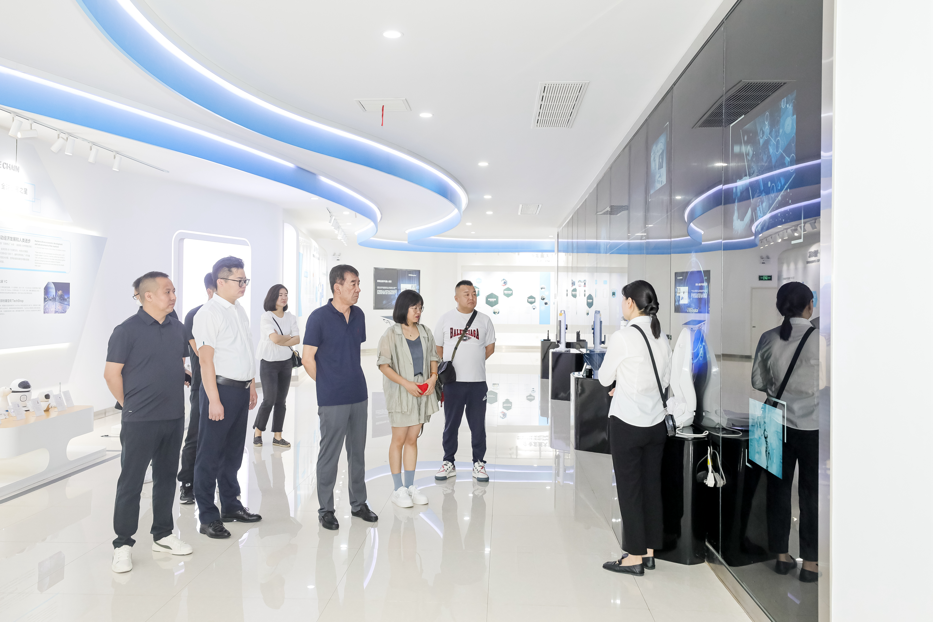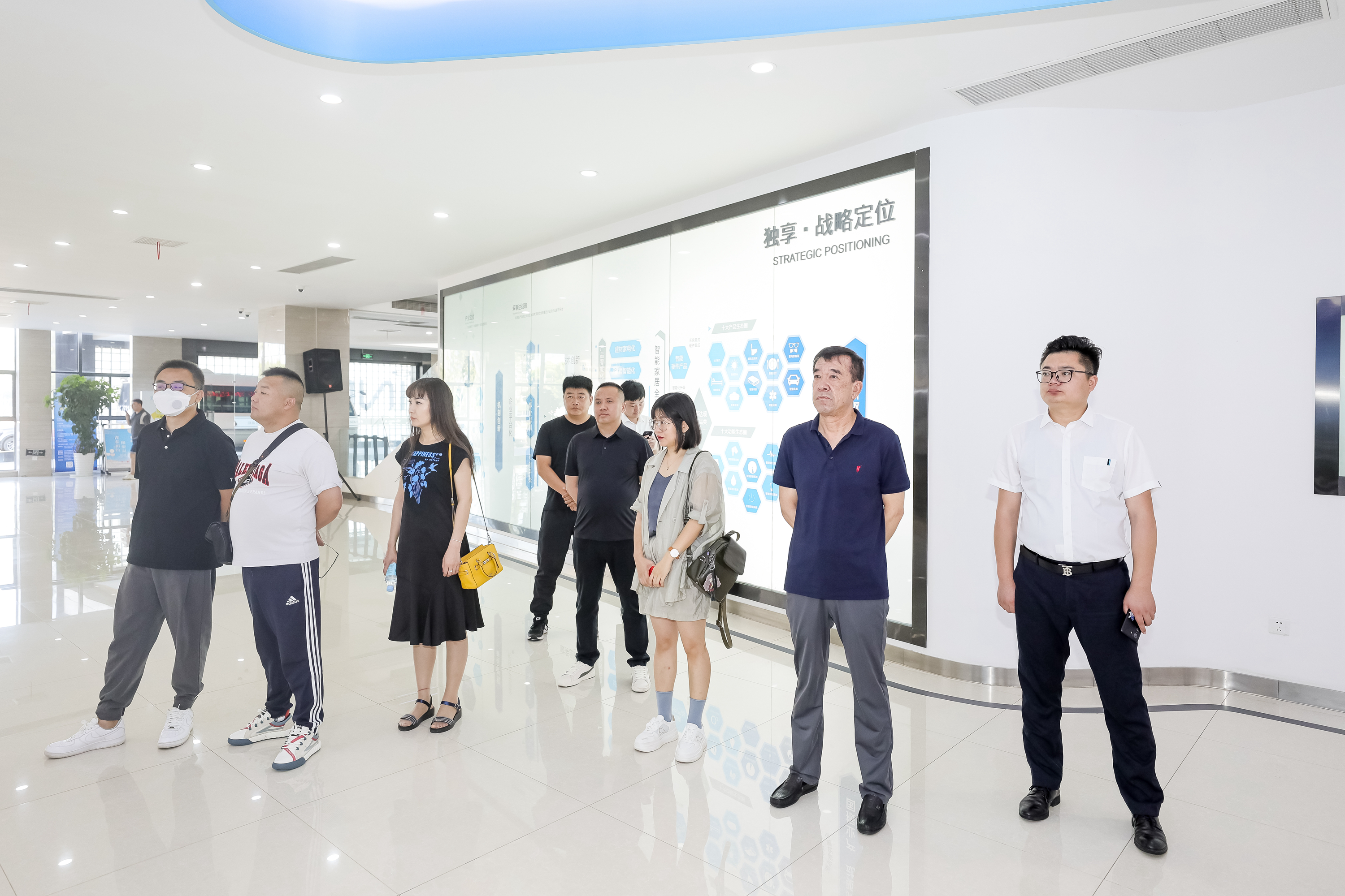 参观完荣事达空气能工厂,众人前往荣事达双创大学,参观智能家居检验检测实验室、品冠E家科技住宅展厅、智慧文旅舱项目展陈等,每一处都有相应专业人员带领讲解展示。荣事达所涉及产品的范围之广、品类之多,让领导们感叹不已,众人边听介绍边参观,时而拍照留念,现场氛围十分融洽。