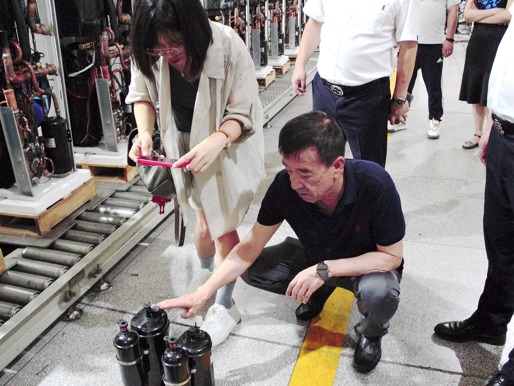 从侧门出服务平台,映入眼帘的便是荣事达空气能工厂。荣事达空气能工厂负责人白礼鹏对领导们的到来表示热烈欢迎,陪同一行人重点参观工厂自动化生产线以及超低温实验室的运作。